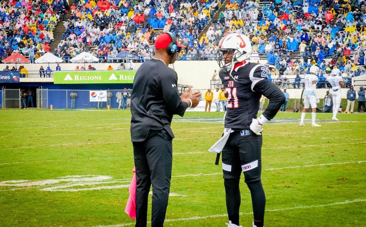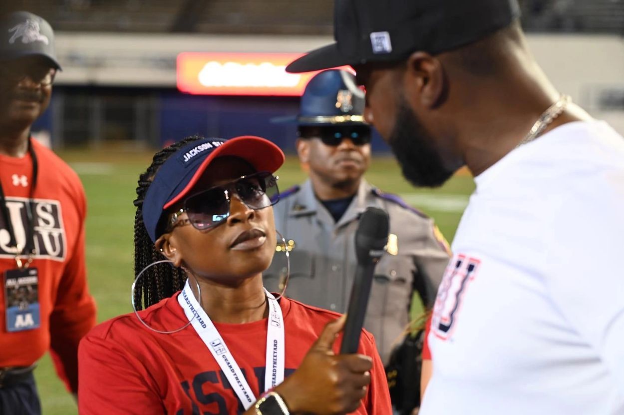 99 Jams Radio Personality Chelle B interviews Coach T.C. Taylor during Jackson State football game at the Mississippi Veterans Memorial Stadium. Photo by:Chesha Lewis